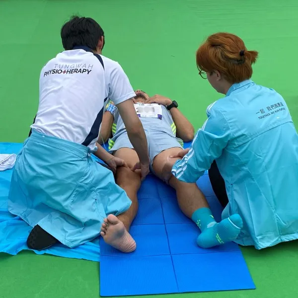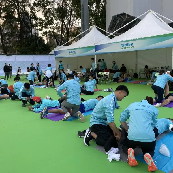 This year, more than 74,000 participants joined the race. It is the first time for the Physiotherapy team at TWC to be invited to participate in this prestigious sports event in Hong Kong. Dr. Nicola Mok, Assistant Professor of physiotherapy at TWC said, “We were a bit anxious as the weather forecast predicted wet and cold conditions in the morning, which could increase the risk of injury. However, we were fortunate that the sky cleared up and the temperature turned out to be ideal for running on the day. We were ready by around 5am, and from then on, we provided non-stop physiotherapy service until 2pm. A total of 445 runners visited the physiotherapy station, with nearly 1,000 treatments provided in total. Under the supervision of experienced physiotherapists, our students assisted in treatments such as massage and stretching for the runners. They all expressed that this was a unique opportunity that allowed them to apply their knowledge while also gaining valuable service experience in sports therapy.”