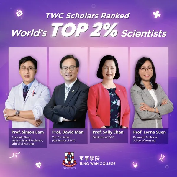 Four TWC Scholars have been listed among the World’s Top 2% Scientists published in 2023 by Stanford University in the US. To mark another year of TWC’s outstanding achievements, Professor Sally Chan, President of TWC, Professor David Man, Vice President (Academic), Professor Lorna Suen, Dean and Professor of School of Nursing, and Professor Simon Lam, Associate Dean (Research) and Professor of School of Nursing, have been on the prestigious list once again.