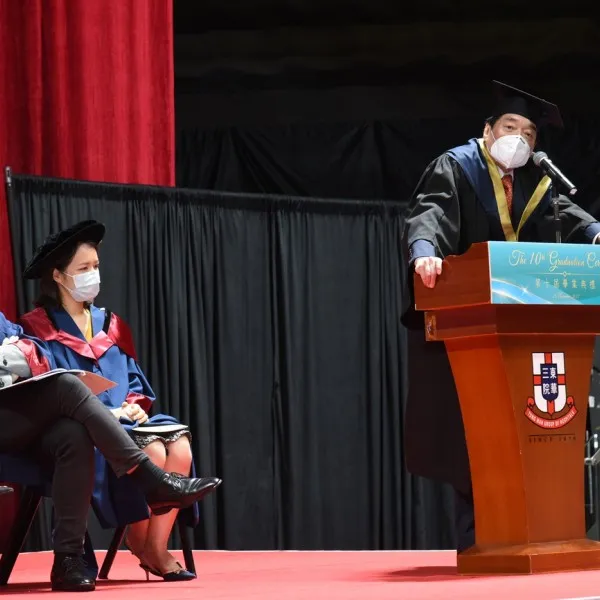 Mr. Alvin Chu, graduate representative of the first cohort of the Bachelor of Science (Honours) in Physiotheraphy, expressed his gratitude to the teachers for striving to make the most out of the tough time during the social unrest and pandemic and managed to give birth to a new batch of physio on time. He also shared a saying from one of his teachers, which he heard when he was preparing for his first in‐patient placement, “Treat the person in the bed as if he or she is your family. In this way, you give the best care to the patient as far as you can.” He also called for his fellow classmates to keep it up together and be worthy of the name of the first cohort of physiotherapy graduates.