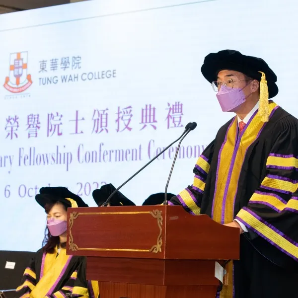 Tung Wah College (TWC) held its first Honorary Fellowship Conferment Ceremony today (6 October), conferring four distinguished individuals, namely Professor Fung Yuk Kuen Sylvia, Dr. Ko Wing Man, Dr. Joseph Lee Chung Tak, and Dr. Walton Li Wai Tat, in recognition of their contributions to TWC and society. The ceremony was officiated by Mr. Philip Ma Ching-yeung, Chairperson of Tung Wah Group of Hospitals Board of Directors 2022/2023 cum Chairperson of Board of Governors of TWC.