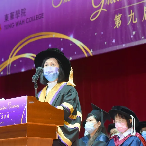 Professor Sally Chan, President of TWC, remarked in her speech that 2021 is a major milestone for TWC after a decade of development. With the enormous contribution and support from donors and all stakeholders, the number of students continues to grow and has reached over 3,400 in this academic year. Professor Chan encouraged the graduates to remember the College’s 10th anniversary slogan, “Thrive with Knowledge, Serve with Heart”. She believes that the knowledge and skills that students have acquired in TWC have formed a strong foundation for themselves. While sense of empathy and social responsibility will bring graduates to the next level in their life journey as they create their future guided by aspirations and goals.