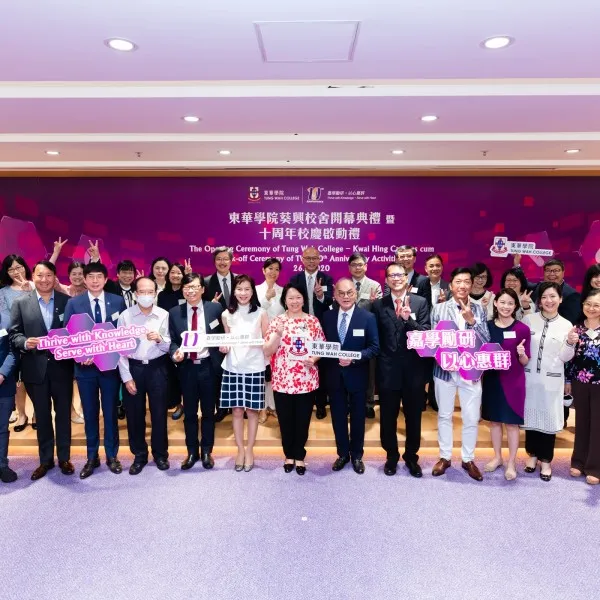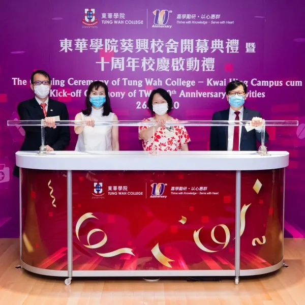 東華學院(學院)於今日(6月26日)舉行葵興校舍開幕典禮暨十周年校慶啟動禮。東華三院主席兼東華學院校董會主席文頴怡小姐、校務委員會主席陳文綺慧女士, BBS、署理校長(學術)林德明教授、署理校長(行政及拓展)何炳裕先生、一眾東華三院顧問局成員、庚子年董事局成員及各界來賓共同主持典禮。