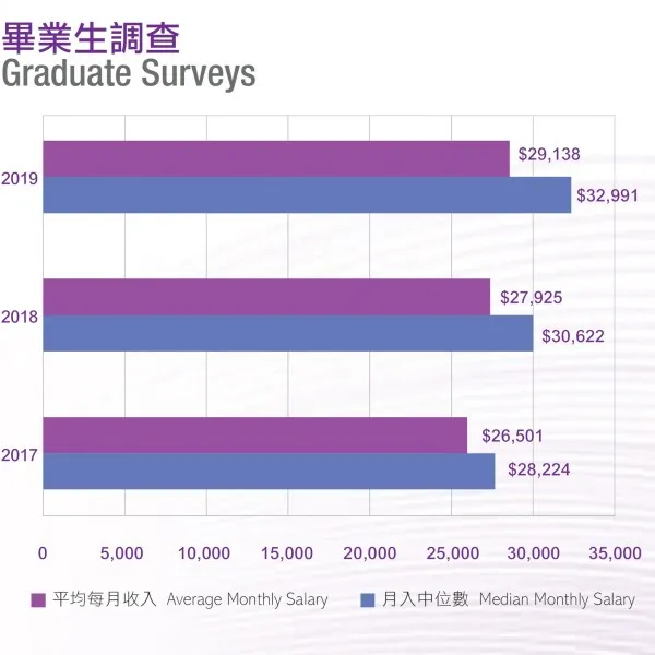 東華學院2019年畢業生的各項薪酬數字均錄得升幅,整體平均月薪達$29,000,較2018年上升約4.4%,月入中位數更接近$33,000,連續第三年錄得良好增長。而學士畢業生的就業前景持續樂觀,平均月薪突破$30,000,較2018年上升5.7%,當中放射治療學(榮譽)理學士畢業生入息最高,平均月入逾$35,800,護理學(榮譽)健康科學學士和職業治療學(榮譽)理學士畢業生,平均月入分別為$32,000及$29,000,反映學院畢業生在就業市場極具競爭力。
