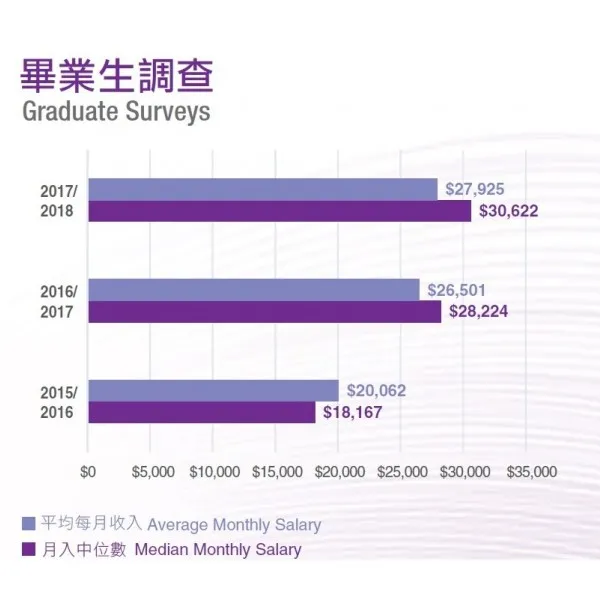 東華學院2018年畢業生職場表現穩步上揚,在多項數字上均錄升幅。全職就業的畢業生平均月薪近$28,000,比2017年的$26,500上升約5%,月入中位數更突破$30,000,當中放射治療學(榮譽)理學士畢業生入息最高,平均月入逾$34,000,護理學(榮譽)健康科學學士和職業治療學(榮譽)理學士畢業生,平均月入分別亦達$30,000及近$29,000,反映學院畢業生在就業市場極富競爭力。