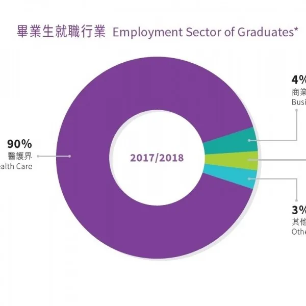 在畢業生投身行業上,2018年度近九成畢業生投身醫護界,反映畢業生深受醫療業界認同,其餘畢業生則在商界(4%)、教育界(3%)和其他界別(3%),擔當不同崗位,為推動本港發展貢獻己力。