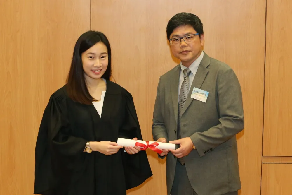 周湛明教授(右)向畢業生逐一頒發畢業證書。