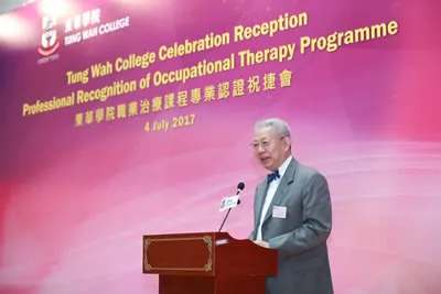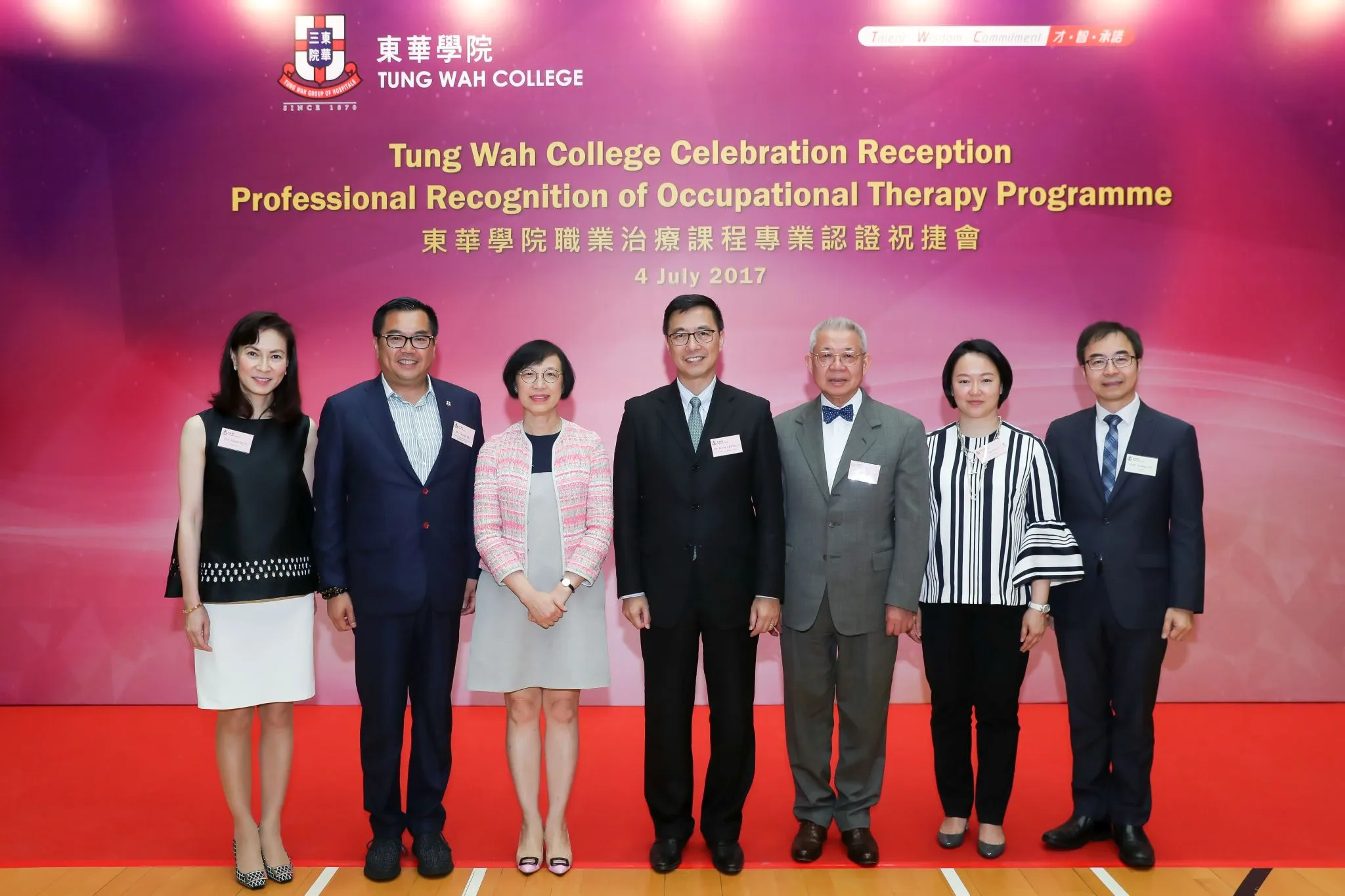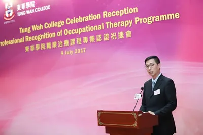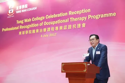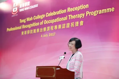 (2017年7月4日-香港) 香港社會正面對人口老化的挑戰,市民對醫療服務的需求隨之增加,亦對服務水平的期望逐漸提高,醫療、復康及護理人員實在供不應求。東華學院一直積極培育醫療護理相關人才,為社會提供適切需要。繼去年醫務化驗和放射治療兩項學士課程通過專業認證評審後,東華學院的職業治療學理學士(榮譽)學位課程於日前再獲輔助醫療業管理局的專業認證,今個學年(2016/17)首屆畢業生已符合申請成為職業治療師的註冊資格。 東華學院自2013/14學年起開辦自資的職業治療學理學士(榮譽)學位課程,首屆(2016/2017)畢業生為34人。繼去年獲世界職業治療師聯合會(WFOT)認可,課程現再通過香港輔助醫療業管理局的專業認證,東華學院成為本港首間提供職業治療學認可學位課程的自資專上學院,而應屆畢業生的資歷同時獲本地以及國際專業機構的認可,可直接註冊成為職業治療師,於公營或私營醫院、特殊學校、非牟利復康及社福等機構工作。今次職業治療學課程成功獲取專業認證,連同上年取得認證的醫療化驗科學及放射治療科學課程,標誌著東華學院的課程質素以及學生的專業水平均獲得各界認同。 學院於今天(7月4日)舉行「職業治療課程專業認證祝捷會」,公布有關課程的最新消息及其他醫護課程的發展。應邀出席的主禮嘉賓包括教育局局長楊潤雄先生、食物及衞生局局長陳肇始教授、輔助醫療業管理局主席左偉國牙科醫生、東華三院董事局主席李鋈麟博士,以及東華學院的校董會主席文穎怡女士、校務委員會主席陳文綺慧女士及校長呂汝漢教授。主禮嘉賓在一眾學院高級管理人員代表陪同下,共同主持簡單而隆重的祝酒儀式,祝賀學院更上一層樓,繼續提供高質素的專上課程,為社會培肓專業人才。
