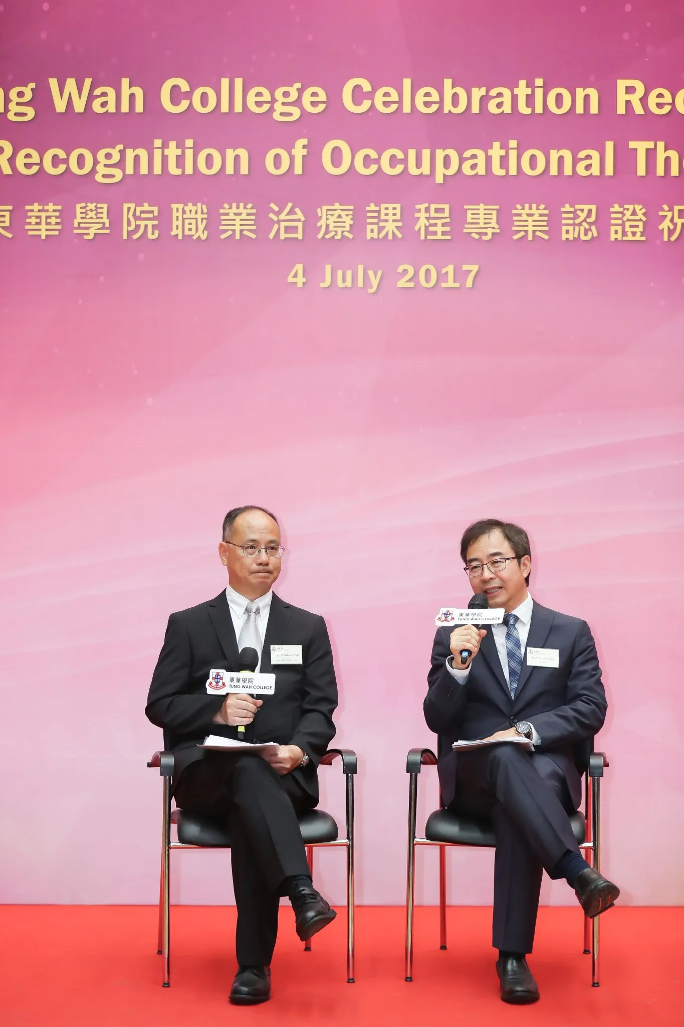 校長呂汝漢教授及健康科學學院院長兼職業治療學課程主任邱貴生教授於問答環節分享有關課程資訊。 東華學院自2010年成立以來,一直提供優質高等教育,在醫護課程方面更於學界佔有優勢,多個學科取得專業認證,相關課程的畢業生可申請成為註冊護士、登記護士、註冊醫務化驗師、放射治療師以及職業治療師,並於本地執業。