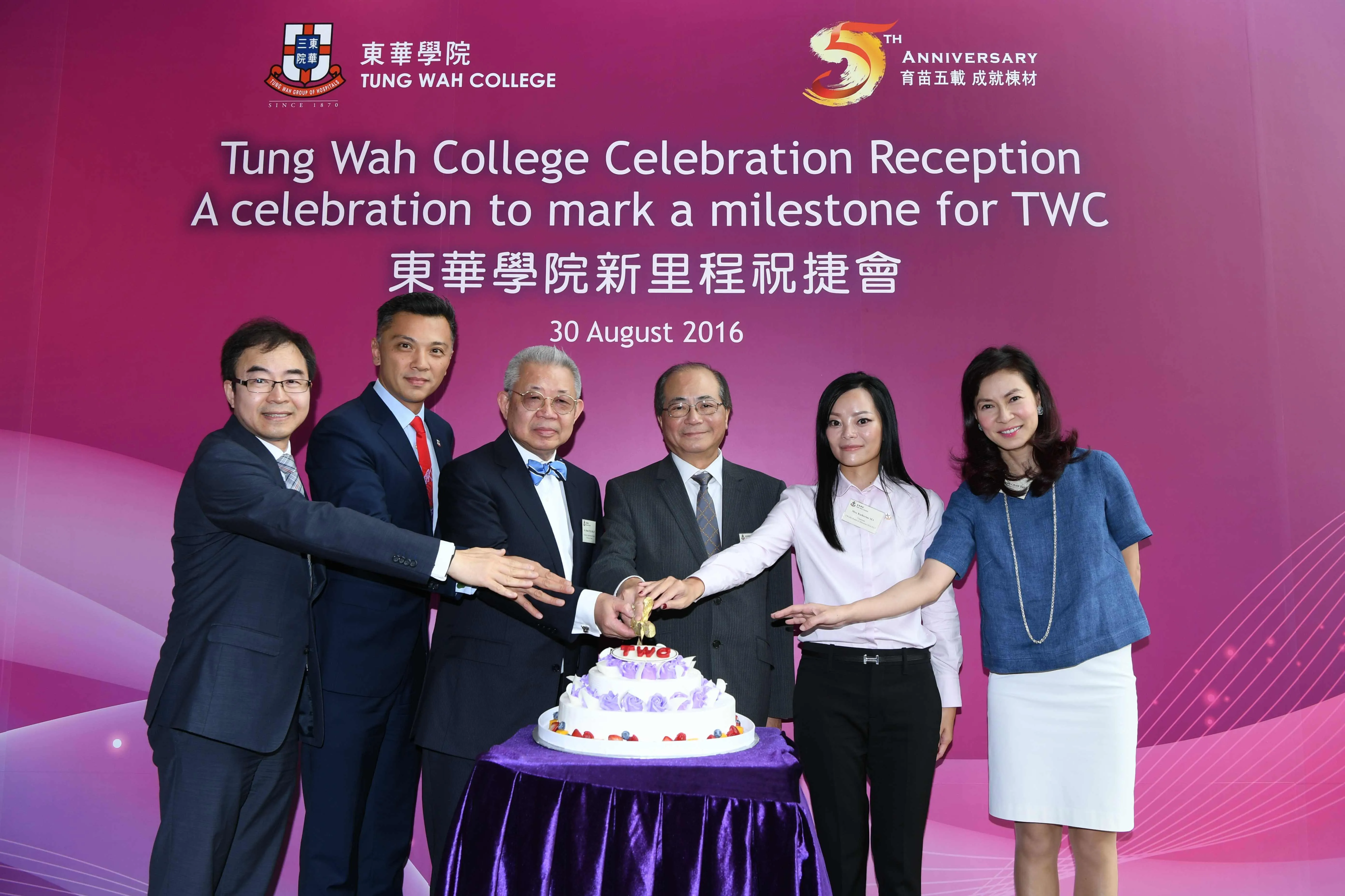 (左起)東華學院校長呂汝漢教授、校董會主席陳祖恒先生、輔助醫療業管理局主席左偉國牙科醫生, S.B.S., J.P.、教育局局長吳克儉先生,SBS,JP、東華三院董事局主席馬陳家歡女士及東華學院校務委員會主席陳文綺慧女士,BBS於「東華學院新里程祝捷會」上主持切餅及祝酒儀式。 教育局局長吳克儉先生在致詞中提及,香港在未來5至10年內將陸續興建及擴建醫院,而每年大學培訓的新醫療化驗師及新放射治療師,卻一直供不應求。他表示:「眾所周知,香港對醫護人員需求甚殷。優質的醫療保健課程,有助優化醫療服務質素,提升個人以至整體社會的健康水平。隨着東華學院課程成功通過專業認證,東華學院的醫療化驗科學學位課程將每年培訓超過20名合資格化驗師,而放射治療學學位課程亦將每年培育至少12名合資格的放射技師,為社會提供醫療界缺乏的人力資源,亦同時提升從業員的專業知識和技術水平,建立與時並進的專業形象。」