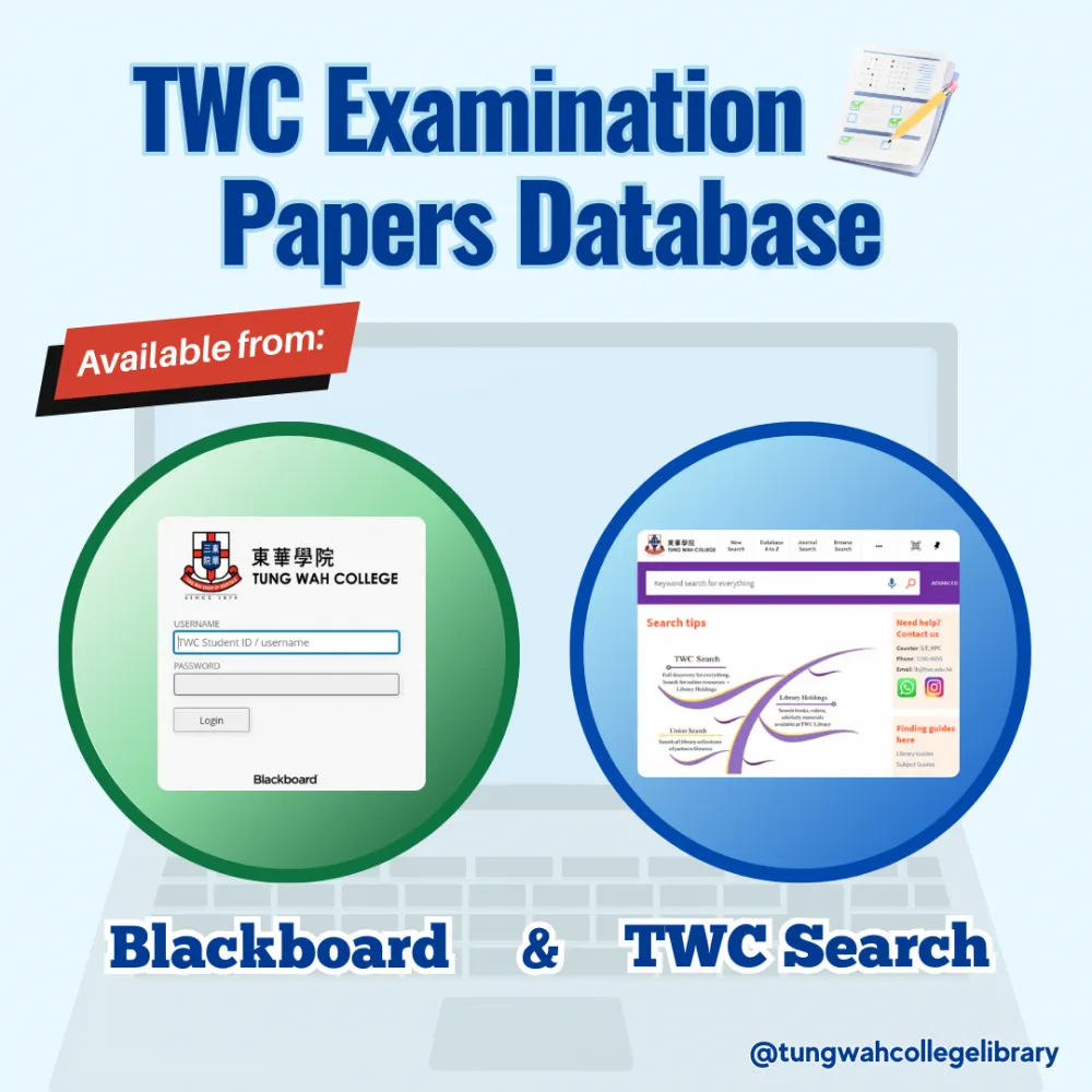 The Library is pleased to let you know that we have created an additional method for accessing pass examination papers. You may now go directly to our TWC Search and locate digital version of past exam papers by searching the Catalogue with a particular course code.