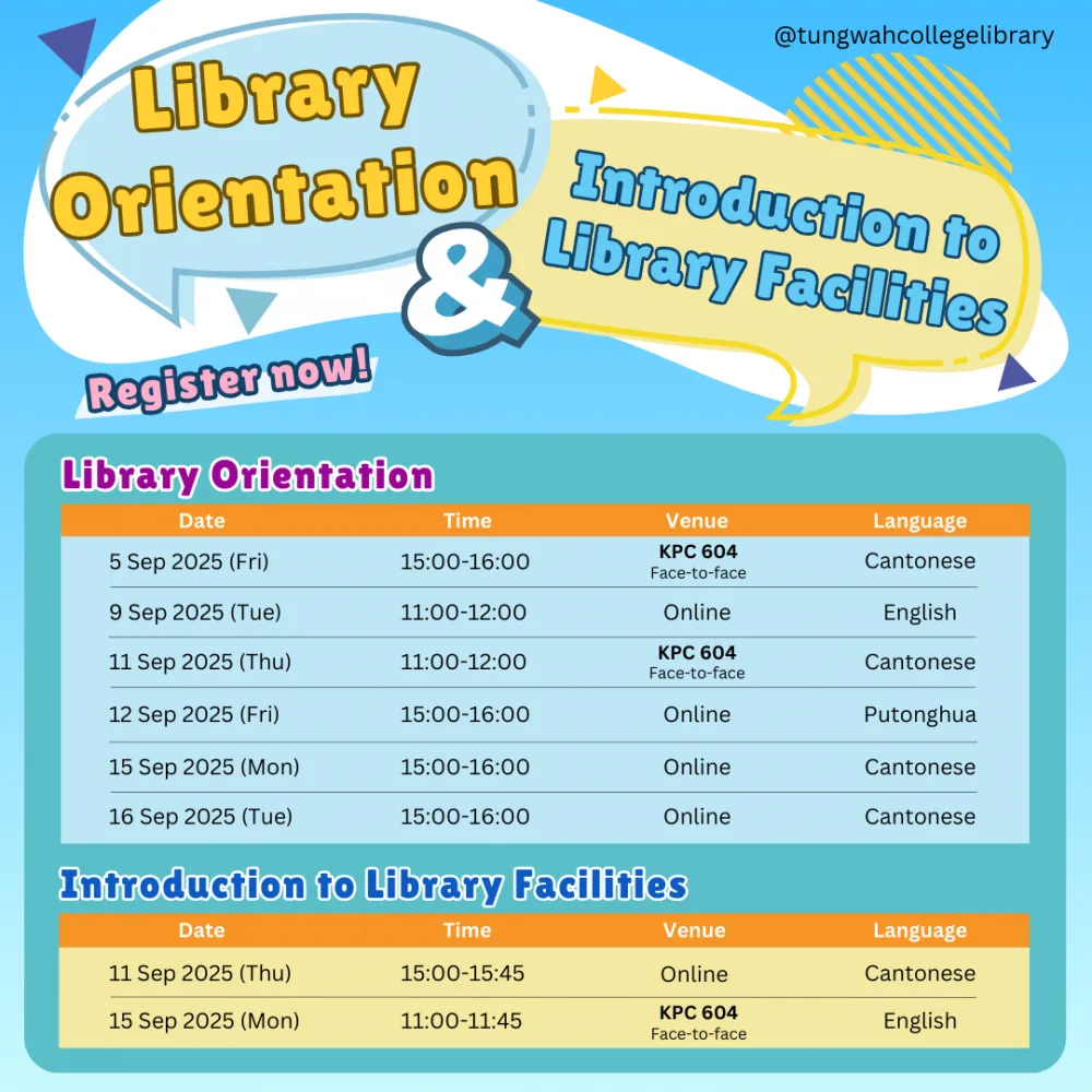 Due to adverse weather conditions, the Library Orientation Workshop (Cantonese) originally planned for 8 September 2025 will be rescheduled to 15 September 2025 (Monday) from 15:00 to 16:00. Please refer to the updated details below to complete your registration: