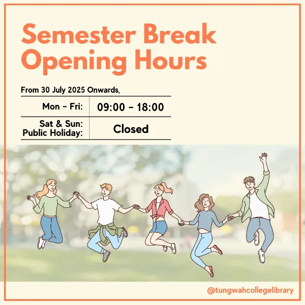 ![]() The last session of the Final Examination will end on 29 July 2025 (Tue). From 30 July 2025 (Wed) onwards, the Library will follow the Semester Break Opening Hours, as shown above. Further details are available at the “Opening Hours” section of the Library website. If you have any enquiry, please feel free to contact us. |