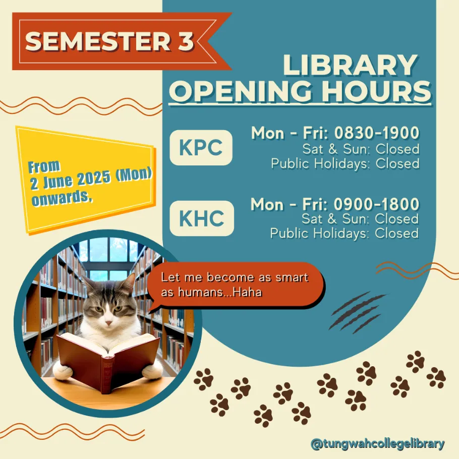 ![]() Semester 3 is coming up next week! From 2 Jun 2025 (Mon) onward, the library will follow the Semester 3 Opening Hours, as shown above. Details can be checked at the “Opening Hours” section of the library website. Should you have more questions about library opening hours, please feel free to contact us. |