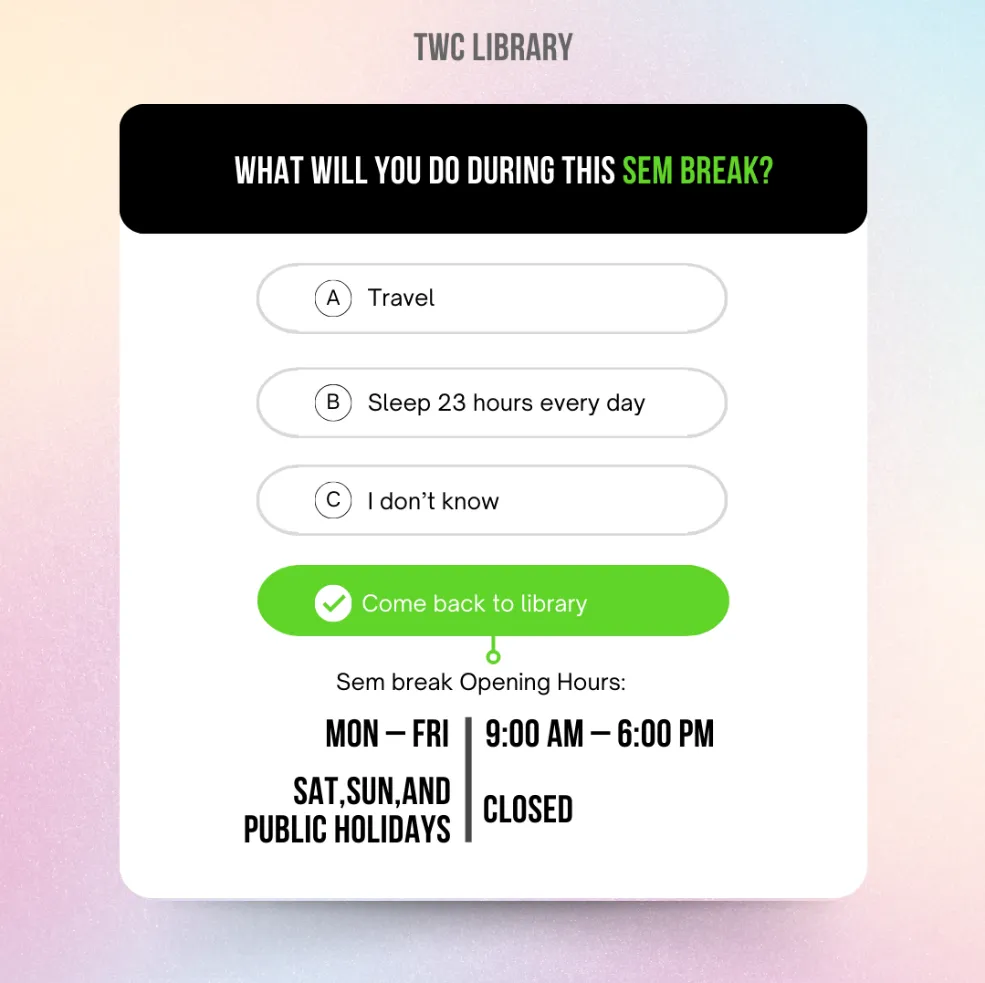 ![]() The last session of the Final Examination will end on 7 May 2025 (Wed). From 8 May 2025 (Thu) onwards, the Library will follow the Semester Break Opening Hours, as shown above. Further details are available at the “Opening Hours” section of the Library website. If you have any enquiry, please feel free to contact us. |