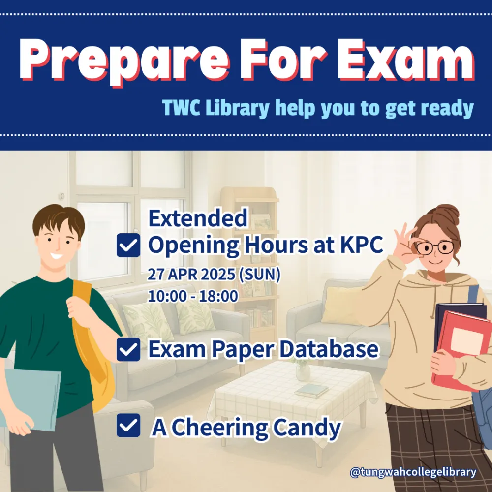 - To facilitate your exam preparation, the Library will open on 27 April 2025 (Sun) from 10:00am to 6:00pm during the Final Examination period.