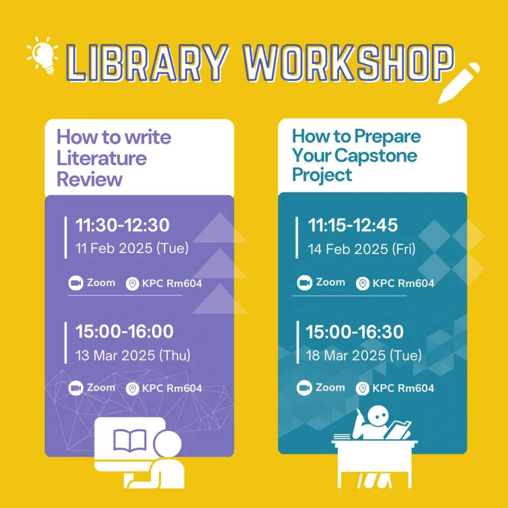 | How to Write Literature Review | Room 604@KPC Library / Online Session via Zoom | 11 Feb 2025 (Tue); 11:30-12:30 13 Mar 2025 (Thu); 15:00-16:00 |