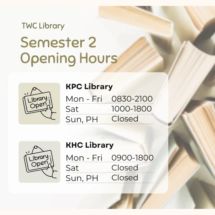 ![]() Semester 2 is coming next week! From 13 January 2025 (Mon) onwards, the library will follow the Semester 2 opening hours as shown above. Details can be checked at the “Opening Hours” section of the Library website. Should you have more questions about library hours, please feel free to contact us. |