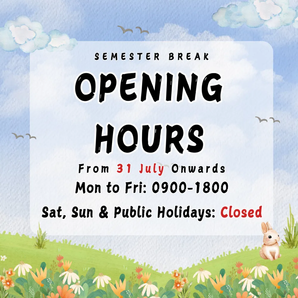 ![]() The last session of the Final Examination will end on 30 July 2024 (Tue). From 31 July 2024 (Wed) onwards, the library will follow the Semester Break Opening Hours, as shown above. Further details are available at the “Opening Hours” section of the Library website. If you have any enquiry, please feel free to contact us. |