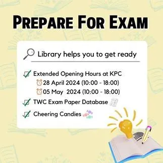 - To facilitate your exam preparation, the library will open on 28 April and 5 May (Sun) from 10:00am to 6:00pm during the Final Examination period.