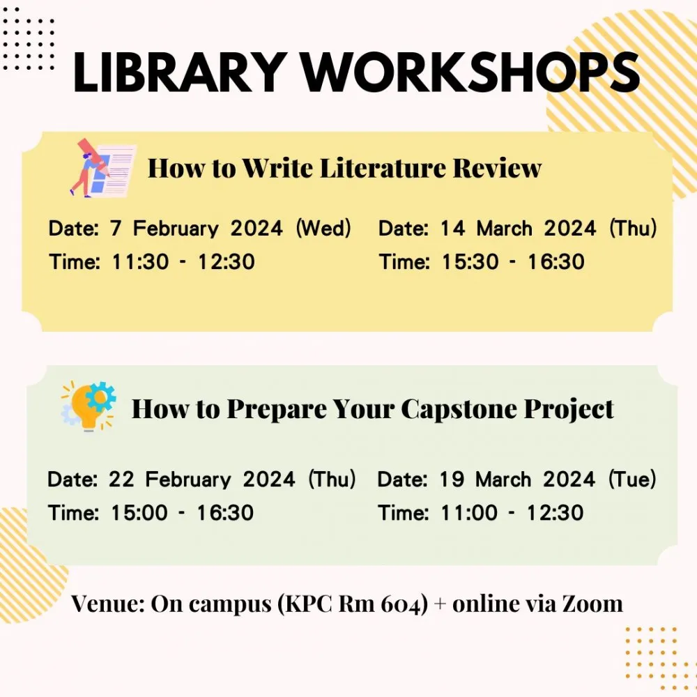 | How to Write Literature Review | Room 604@KPC Library / Online Session via Zoom | 7 Feb 2024 (Wed); 11:30-12:30 14 Mar 2024 (Thu); 15:30-16:30 |