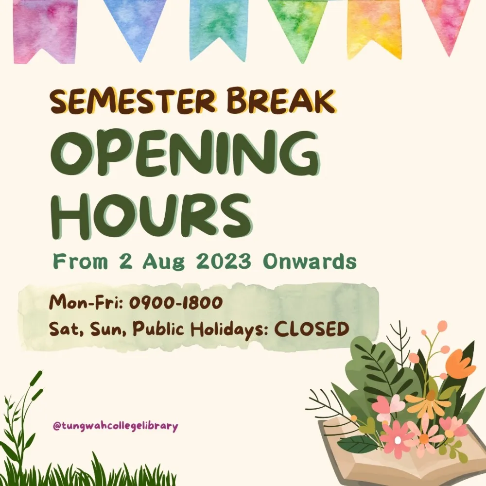 ![]() The last session of the Final Examination will end later on 1 August. From 2 August 2023 onward, the library will follow the Semester Break Opening Hours, as shown above. Further details are available at the “Opening Hours” section of the library website. If you have any enquiry, please feel free to contact us. |