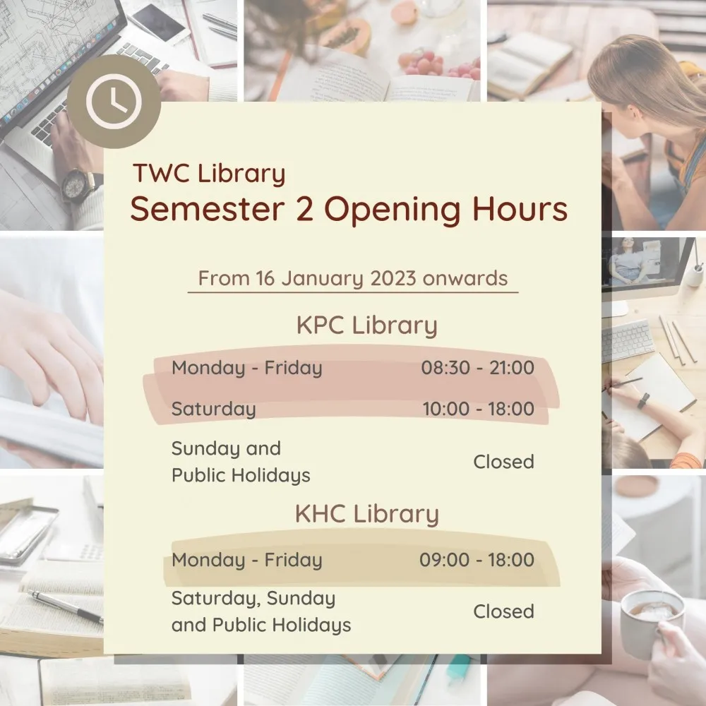 ![]() Semester 2 is coming next week! From 16 January 2023 (Mon) onwards, the library will follow the Semester 2 opening hours as shown above. Details can be checked at the “Opening Hours” section of the library website. Should you have more questions about library hours, please feel free to contact us. |