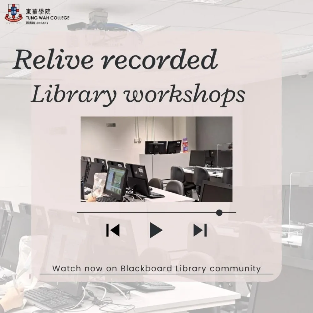 To support e-learning, these Library Workshops have been recorded and you can watch them in Blackboard to enhance your information literacy skills at your own pace.