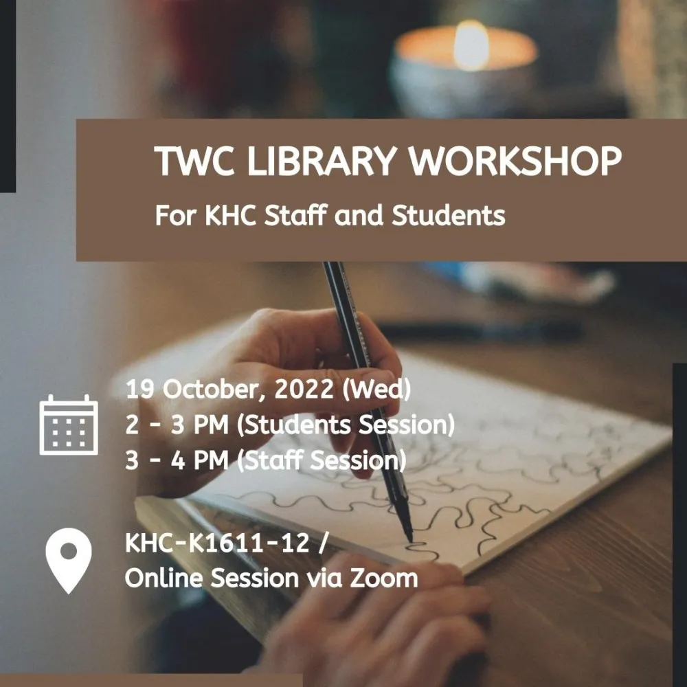 | Library Workshop for KHC Students | KHC-K1611-12 / Online Session via Zoom | 19 Oct 2022 (Wed); 14:00-15:00 |
