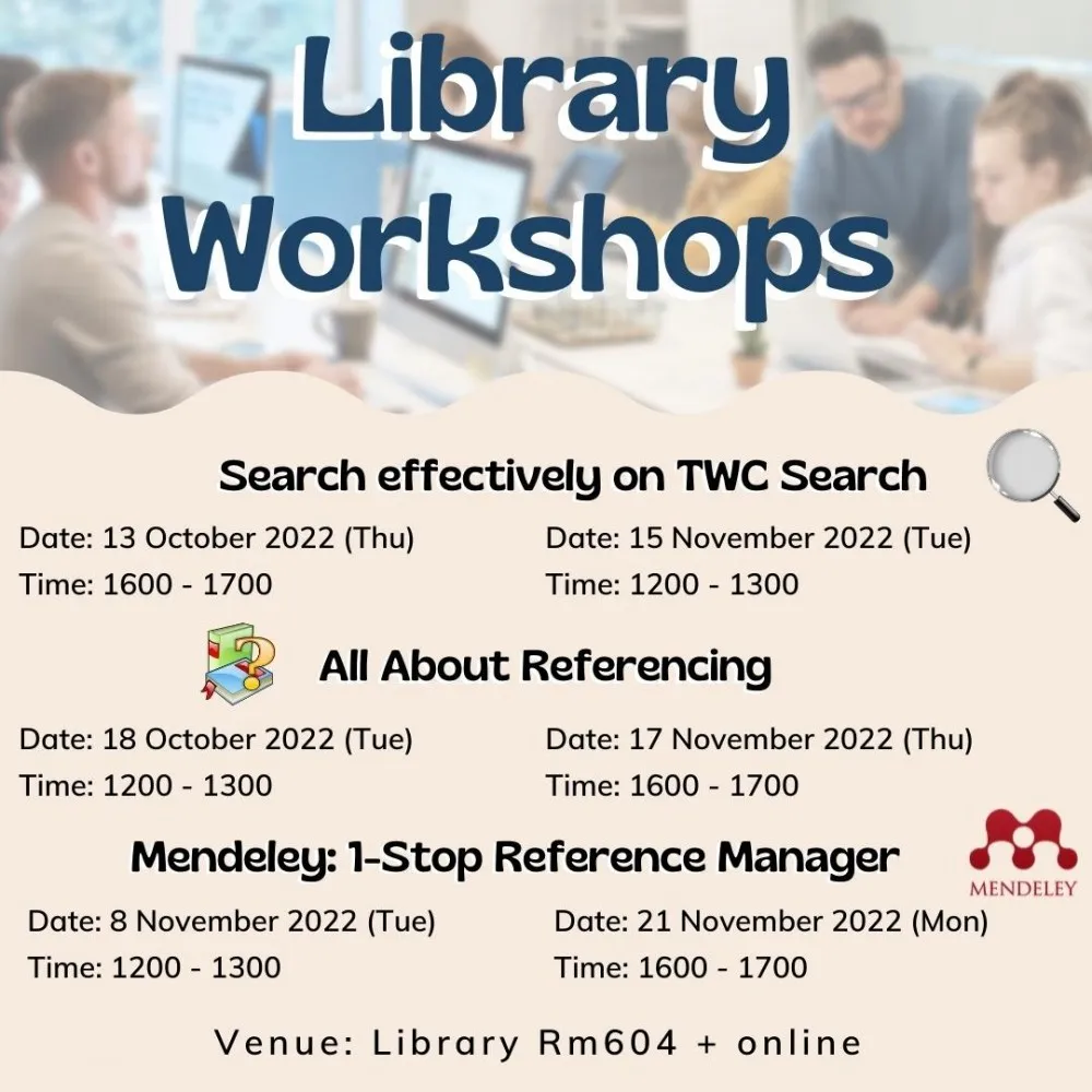| Search Effectively on TWC Search | Room 604@KPC Library / Online Session via Zoom | 13 Oct 2022 (Thu); 16:00-17:00 15 Nov 2022 (Tue); 12:00-13:00 |