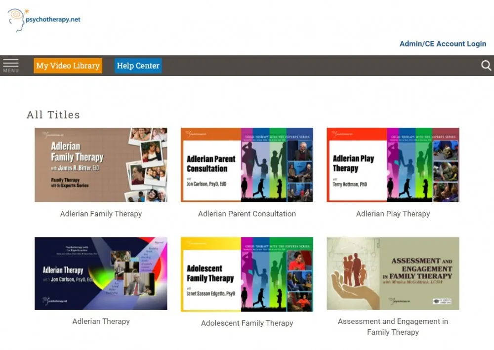 | Psychotherapy.net Training Videos in Psychotherapy The Library is pleased to introduce Psychotherapy.net, a specialized database containing psychotherapy and counselling videos. The collection includes 100 titles from actual therapy sessions and training videos conducted by renowned psychotherapists. To learn more about Psychotherapy.net, please click here for details. If you have any questions about this database, please feel free to contact us. |