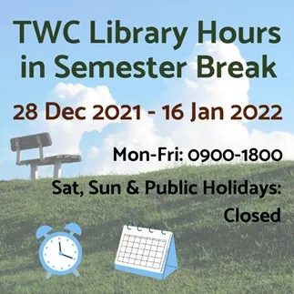 The last session of the Final Examination will end later on 24 December. From 28 December 2021 onward, the library will follow the Semester Break Opening Hours, as shown above.