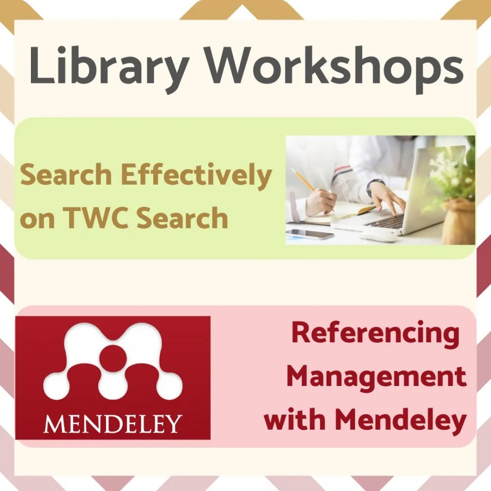 | Search Effectively on TWC Search | Room 604@KPC Library / Online Session via Zoom | 7 Oct 2021 (Thu); 11:30-12:30 9 Nov 2021 (Tue); 15:00-16:00 |