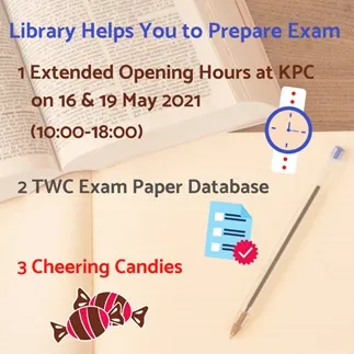 - To facilitate your exam preparation, the Library will open on 16 May 2021 (Sun) and 19 May 2021 (Buddha’s Birthday Public Holiday) from 10:00am to 6:00pm during the Final Examination period.